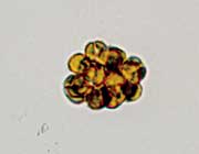 細胞は長細い卵形で、2本のベンモウをもち、魚のうろこのような鱗片におおわれています。これらの細胞が球形〜楕円形の群体をつくり、回転しながら泳ぎます。 100〜150倍の顕微鏡では、鱗片は見えませんが、色(黄金色)や群体の形から同定できます。
